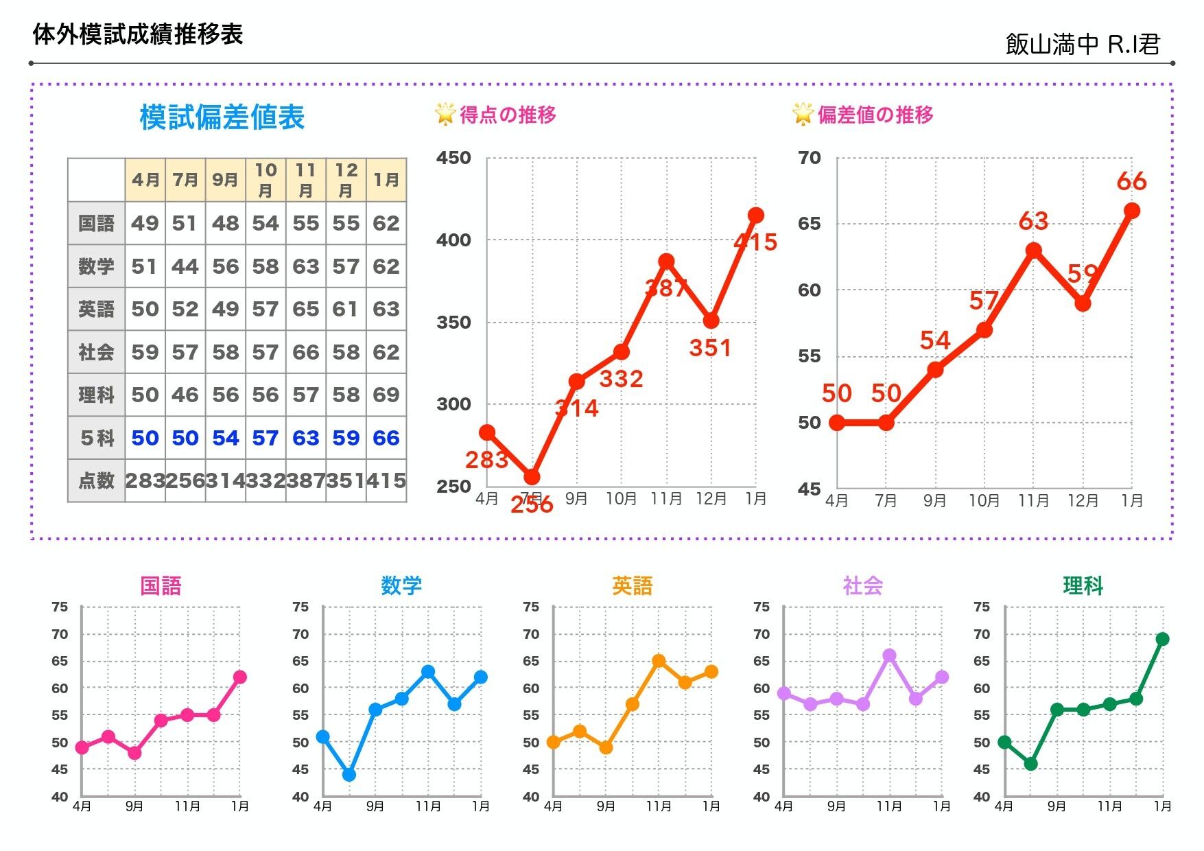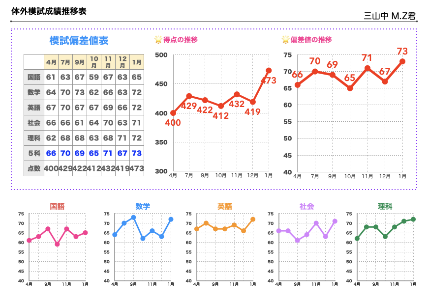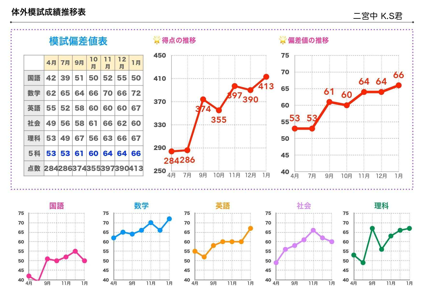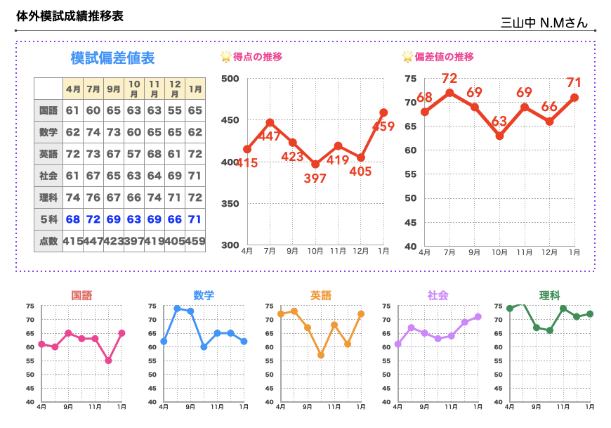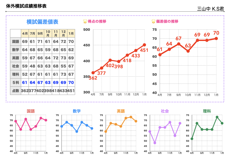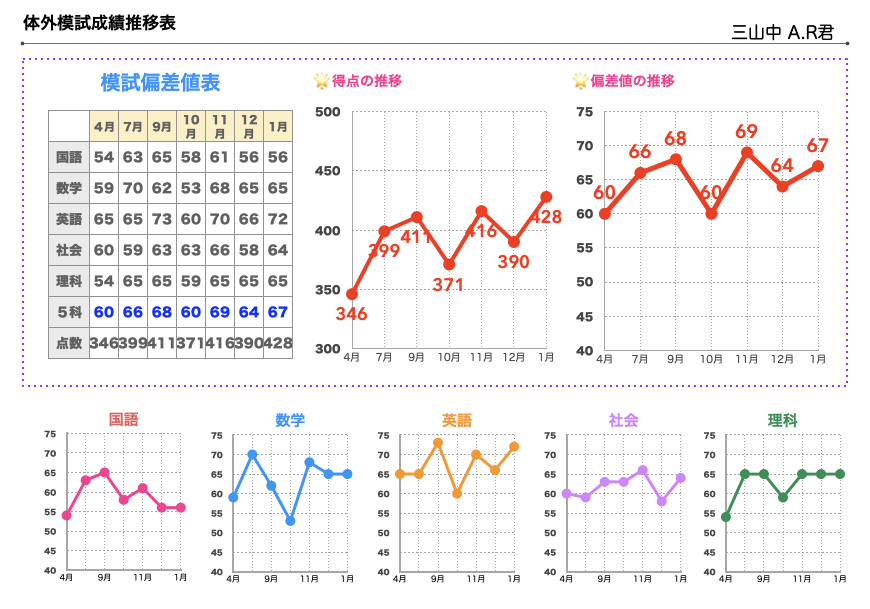 中学3年生の一年間では平均9.3UPしております。(2021年現在)